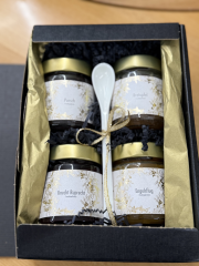 Vier verschiedene Fruchtaufstriche, verpackt, ideal als kleine Aufmerksamkeit.
